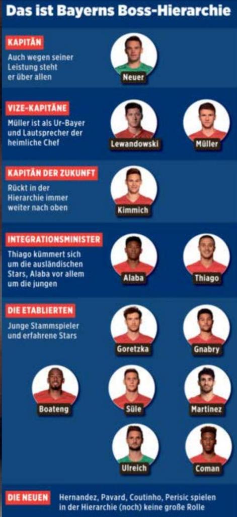 《图片报》指出,作为球队队长兼功勋球员,诺伊尔是拜仁队内权利以及层级最高的球员。此外,副队长莱万多夫斯基以及穆勒坐落球队层级的第二层。值得关注的是,近来身处舆论漩涡的基米希独居第三级,是拜仁钦点的未来队长人选。