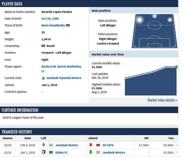 北京时间2月6日消息,据德转管理员朱艺透露,全北巴西前锋里卡多·洛佩斯已经转会上港。根据球员资料显现,转会费为546万欧元(约合4200万人民币)。