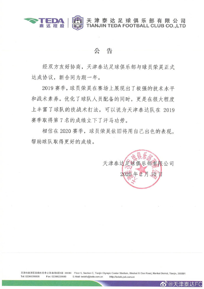 经双方友好协商,天津泰达足球沙龙与球员荣昊正式达成协议,新合同为期一年。
