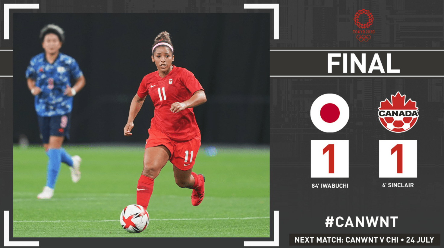 日本女足此役排出4-4-2阵型,在锋线上由效力于阿森纳女足的岩渊真奈和30岁的老将菅泽优衣香伙伴,不过日本队的先发阵容平均年龄只有26.9岁。上半时开场,日本女足场略显被迫。第6分钟,38岁的老将辛克莱尔接右路传球推射,皮球击中左立柱从门前而过,辛克莱尔跟进近距离左脚推射空门得手,这是辛克莱尔在300场国家队竞赛中奉献的第187球。加拿大女足1-0抢先。
