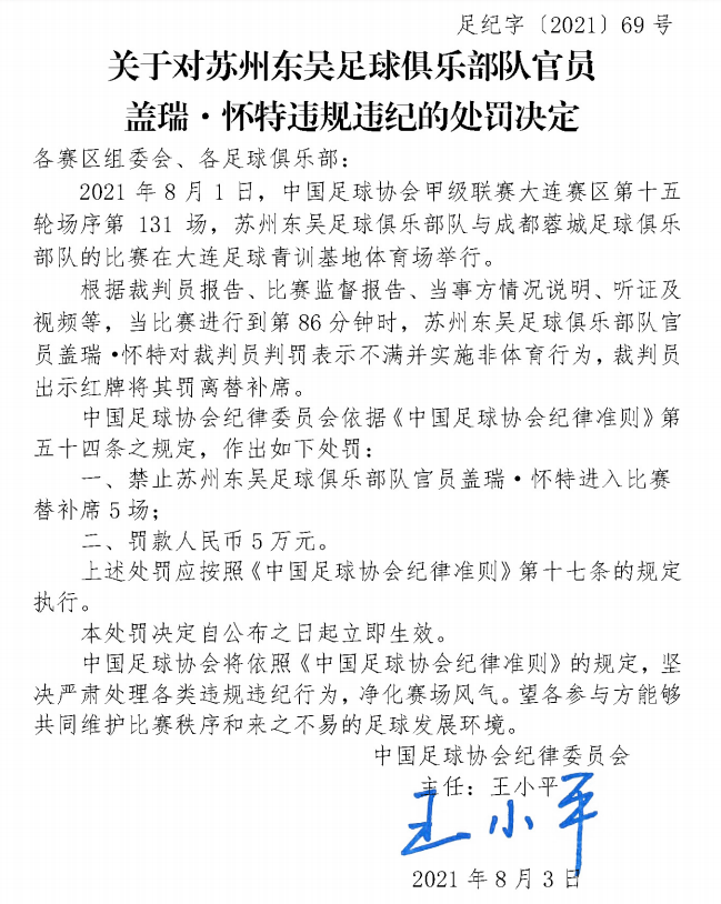 北京时间8月4日消息,足协开出罚单,中甲球队苏州东吴主帅盖瑞·怀特由于在第15轮对阵成都队的比赛中,对裁判表示不满并实施非体育行为,被禁赛5场,罚款5万元。