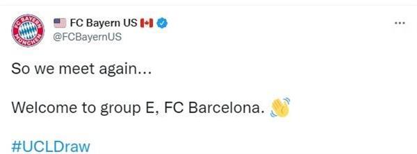 北京时间8月27日凌晨,2021-22赛季欧冠小组赛抽签结束,巴萨与拜仁、本菲卡、基辅迪纳摩同分在E组。本赛季,拜仁作为上赛季德甲冠军被分到榜首档球队,而巴萨则是第二档球队。在第二轮抽签中,巴萨被抽到拜仁地点的E组,随即,拜仁官推榜首时间喊话巴萨,推文写道:“咱们又见面了,欢迎来到E组,巴塞罗那。”