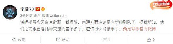 此外,据媒体人李璇报道,曹睿应该很快将接手南通支云。李璇写到:“谢晖指导今天自宣辞职,我理解,南通方面应该是有新帅到队了,据我所知,他们之前跟曹睿指导交流的差不多了,应该很快能接手了。”