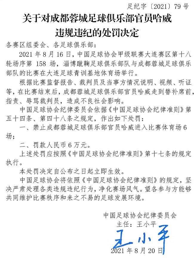 北京时间8月20日,中国足协公布最新罚单,成都蓉城足球俱乐部官员哈威因指责、辱骂裁判,被停赛6场罚款6万。