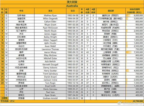 9月2日讯 12强赛首轮,澳大利亚对阵国足的23人大名单已经公布!本场比赛将在北京时间9月3日清晨2点打响。