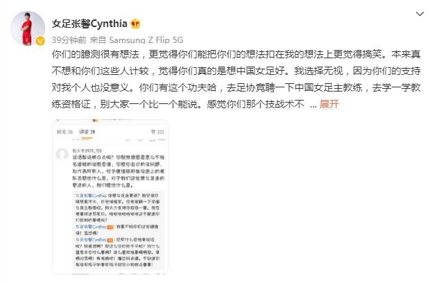 张馨写到:你们的臆测很有主意,更觉得你们能把你们的主意扣在我的主意上更觉得搞笑。本来真不想和你们这些人计较,觉得你们真的是想中国女足好。我选择无视,由于你们的支撑对我个人也没意义。你们有这个功夫哈,去足协竞聘一下中国女足主教练,去学一学教练资格证,别我们一个比一个能说。感觉你们那个技战术不得了啊!我都敬服!想diss我欢迎来战,我奉陪到底!