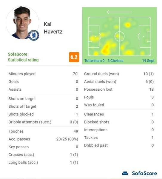 哈弗茨本场比赛进场70分钟3次射门均没有射正,3次尝试过人也没有1次成功。共触球49次,25次传球成功了20次。