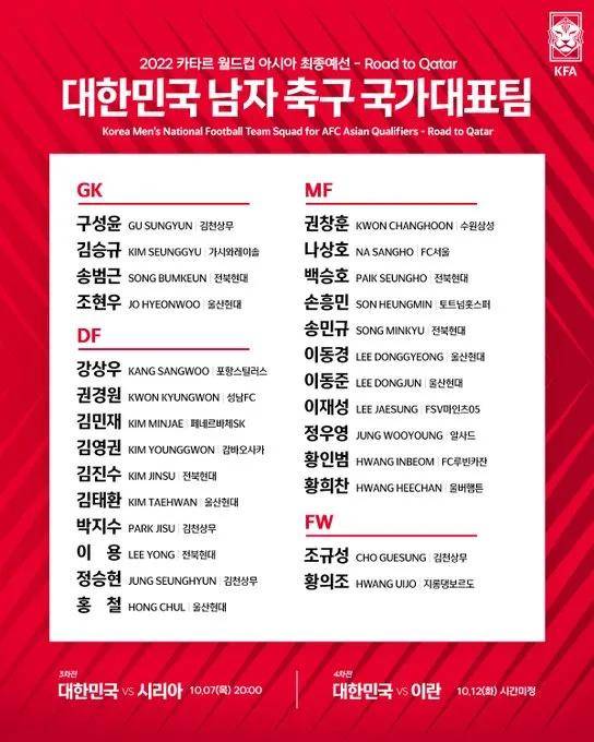 韩国队公布10月12强赛名单:孙兴慜领衔 泰山中场无缘