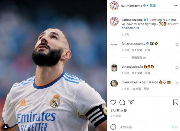 本泽马在个人交际平台发文表示:“结果令人沮丧,但咱们将持续战役……”