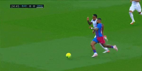 北京时间10月24日22:15,2021-22赛季西甲第10轮,巴塞罗那主场迎战皇家马德里。25分钟德佩左路强行打破后横传,法蒂前点一磕,德斯特中路小禁区前右脚推射踢飞。