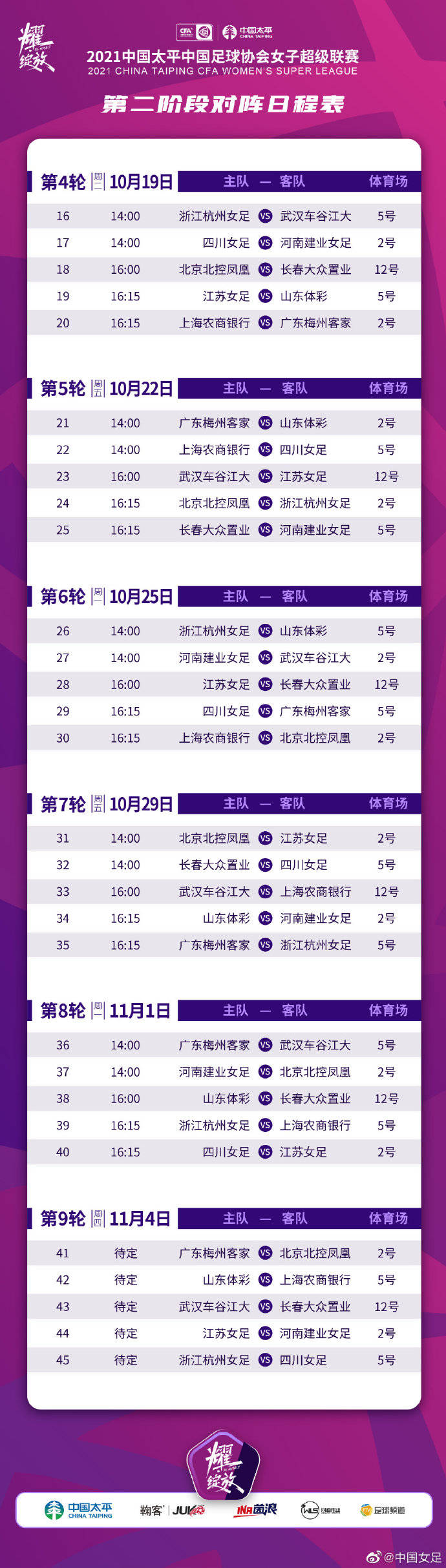 北京时刻10月16日消息,我国女足官方发布了女超联赛第二阶段的路程。