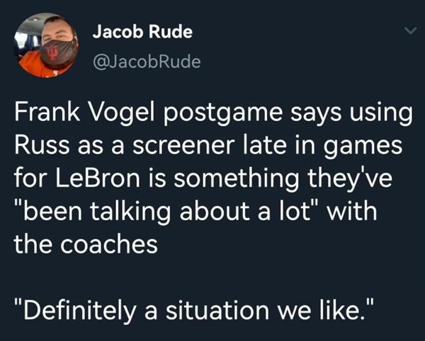 在比赛最后三分钟,威少上提给詹姆斯挡拆,之后中路顺下接老詹传球吸引包夹,助攻空切的浓眉哥轻松双手扣篮。湖人队主帅弗兰克-沃格尔赛后接受采访时表明让威少给詹姆斯挡拆的战术是他们教练组讨论过很多次的,直言这肯定是他们都喜爱的打法。很显然,尽管威少的外线投射缺乏要挟,但他真的在尽力学习打无球,教练组也在尽力帮他融入球队,咱们仍是需要对威少多点耐性,而非一味冷嘲热讽。