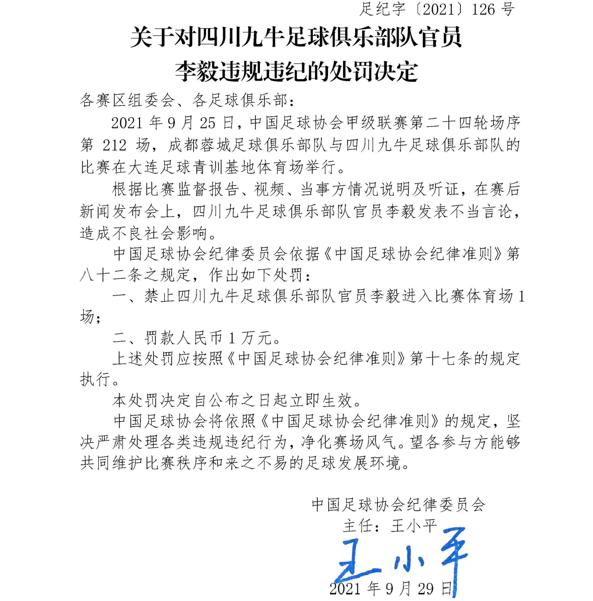 北京时间9月29日,中国足协官方发布公告,中甲四川九牛主帅李毅在赛后新闻发布会宣布不当言辞,被停赛1场、罚款1万元。