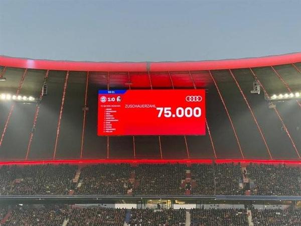 安联球场的大屏幕在竞赛下半场时特别公示了本场竞赛的现场球迷人数,进场球迷达到了75000名。而安联球场的容纳上限大约是75024人。