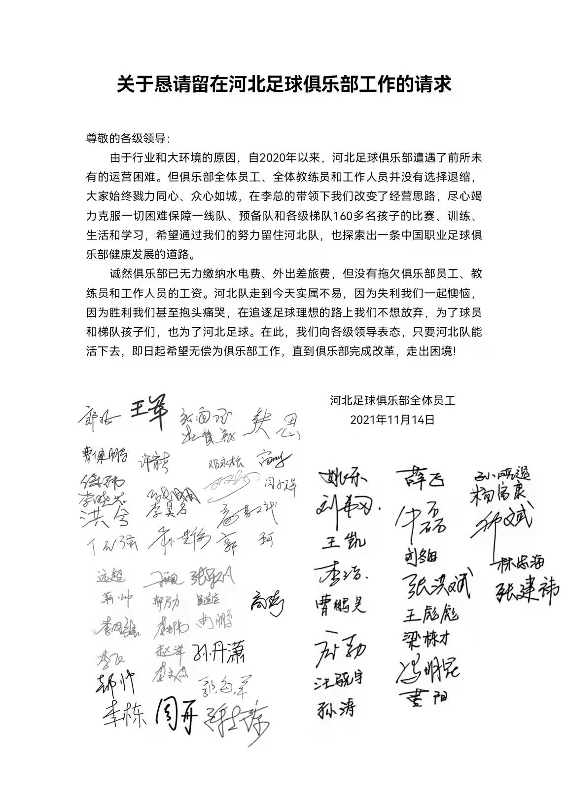 河北队员工联名表态:希望为俱乐部无偿工作 直到完成股改