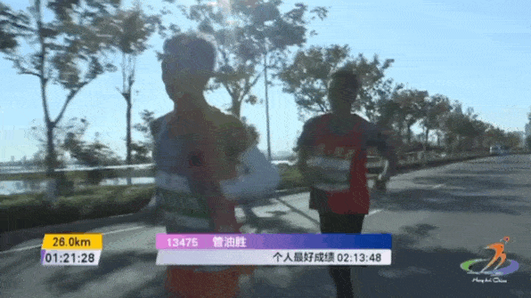 15公里处,男人榜首集团用时约46分55秒。21公里处,包毕力格掉队,26公里处,管油胜和杨定宏二人仍未拉开距离,用时约1小时21分,配速3分08秒/公里。