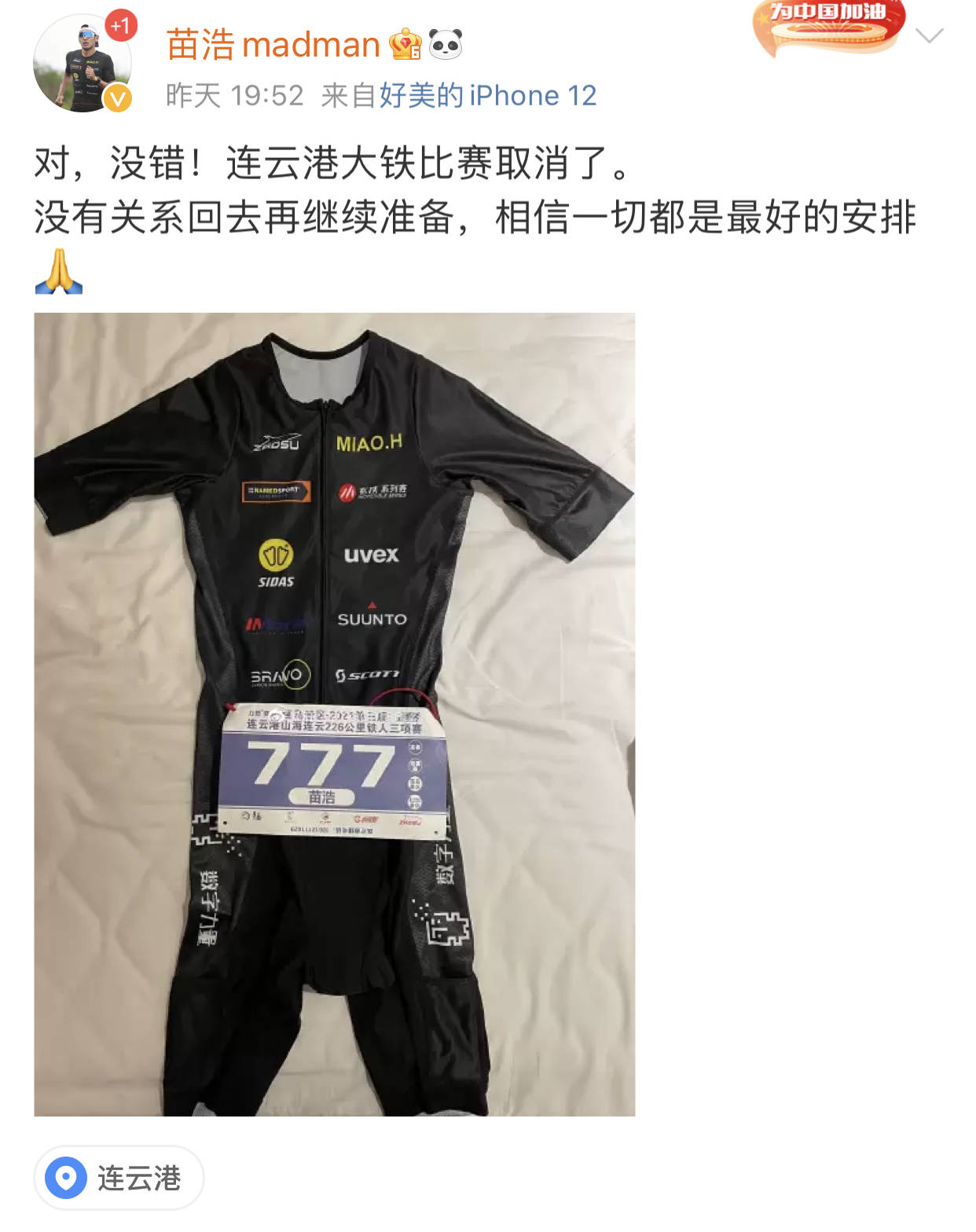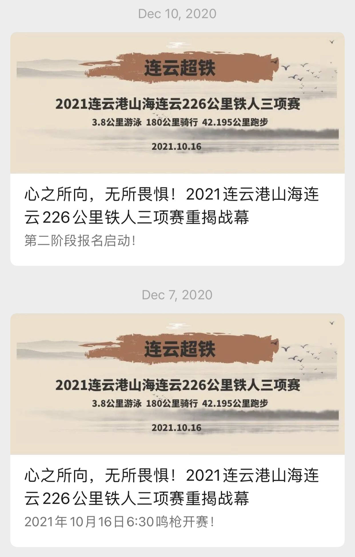 而翻开该赛事的官方大众号“力然赛事”,也找不到任何关于此次超铁赛事撤销的阐明文件,大众号最近的一次更新是在2021年6月9日,与本次连云港226公里铁三赛有关的最后一条音讯,则是2020年12月10日发布的“第二阶段报名发动”。翻开仅有的相关链接,显现的只要四张照片,其中两张重复的图片上,一群人围坐在圆桌旁碰杯。