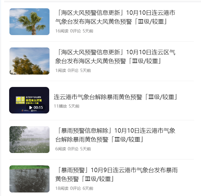 10月15日上午9时40分,连云港市气象台发布海区劲风黄色预警信号,受强冷空气影响,估计未来24小时内,连云港海区将呈现7-8级阵风9-10级的偏北劲风。除此之外,在过去的一周,连云港气象台也发布了屡次劲风气候预警。