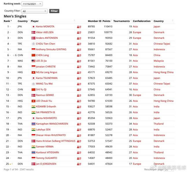 北京时刻11月16日,国际羽联发布了新一期的国际排名,在男单排名中,中国选手谌龙排在第6,石宇奇排在第12,别的也现已没有了林丹的姓名。尽管林丹早在上一年就宣告退役,但他并没有请求排名移除,所以这一年多来,我们一直能在国际羽联的排名榜中看到他的姓名。