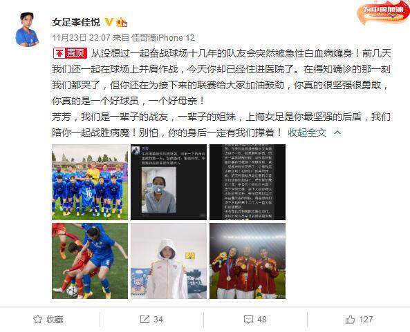 北京时间11月24日,据报道,上海女足老将邱芳芳疑似患急性白血病目前正在接受治疗。随后,上海女足球员李佳悦在个人社交媒体发文,为队友邱芳芳送上了祝福。