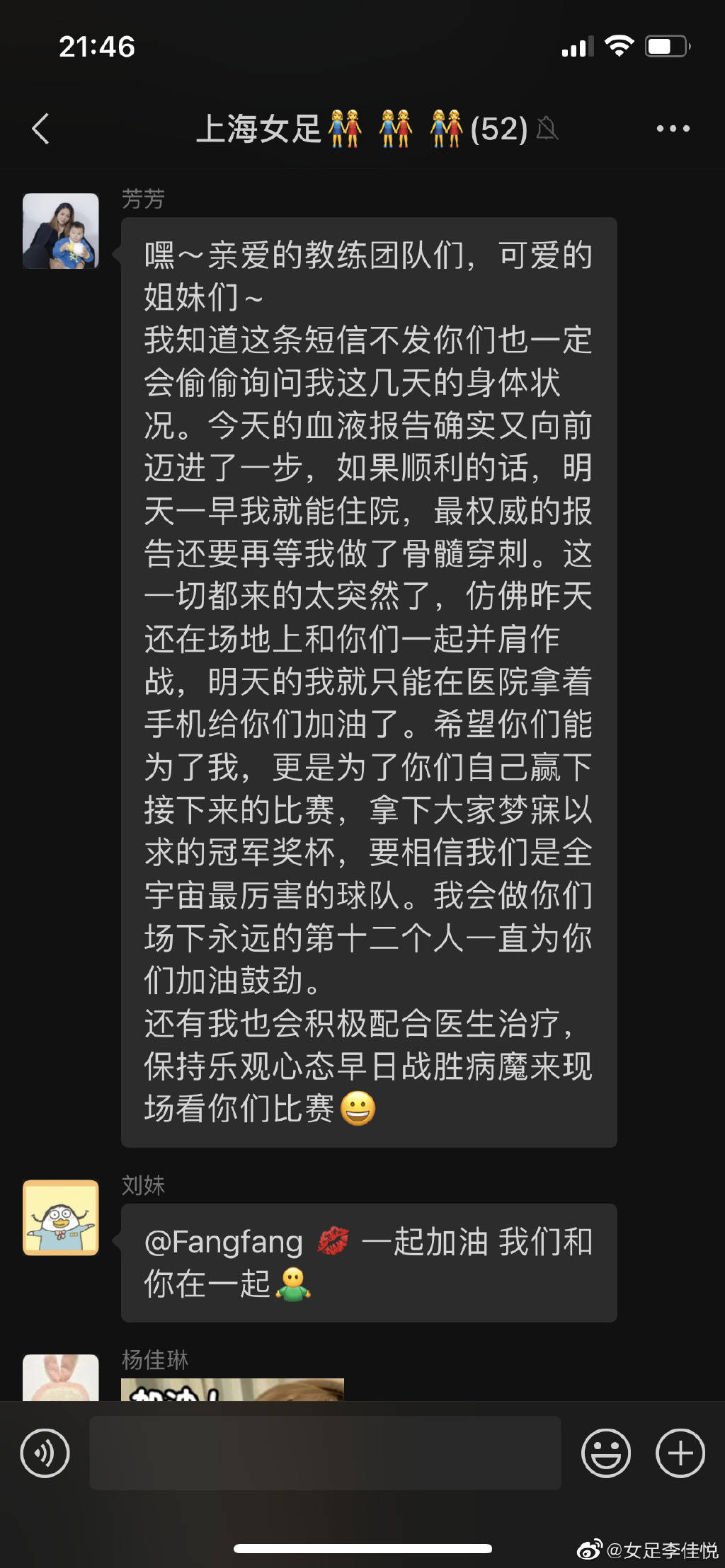 芳芳,咱们是一辈子的战友,一辈子的姐妹,上海女足是你最刚强的后台,咱们陪你一同战胜病魔!别怕,你的身后一定有咱们撑着!