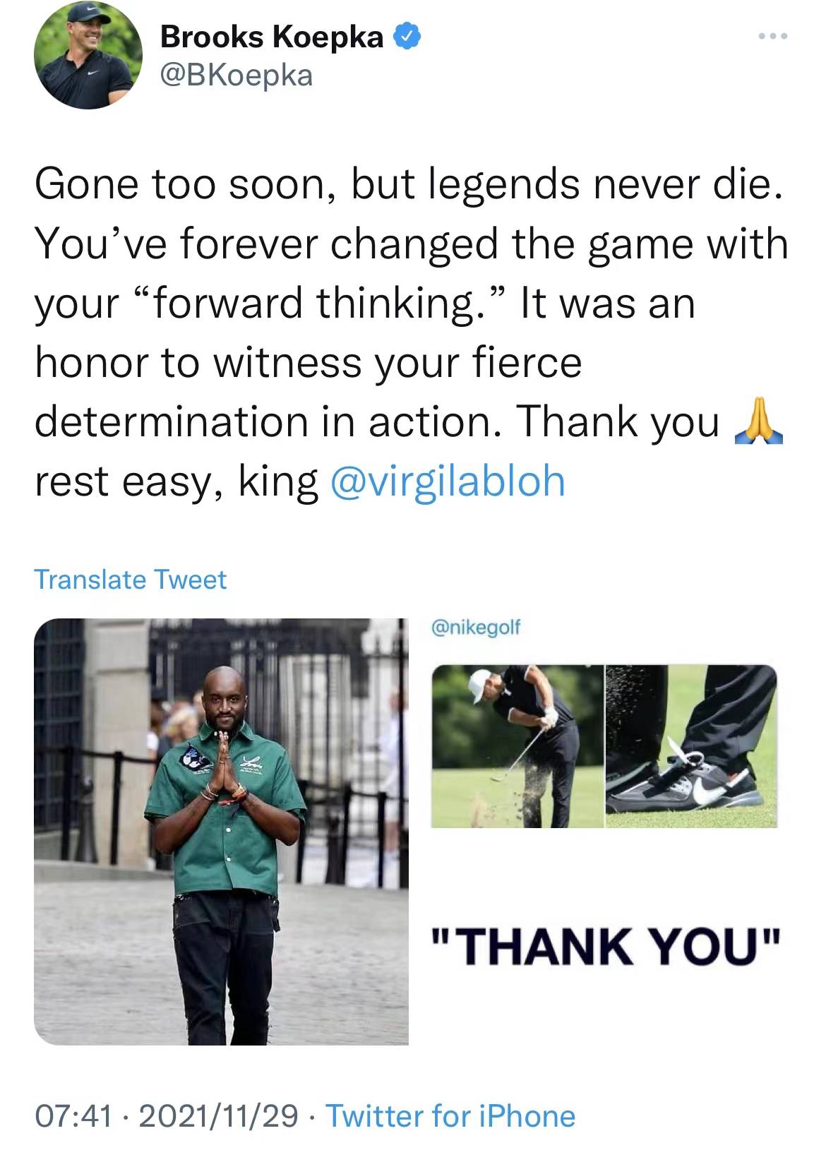 北京时间2021年11月29日音讯,Off-White创始人、LV男装艺术总监非洲裔规划师 Virgil Abloh 因癌症过世,享年41岁。高尔夫名家、四届大满贯得主布鲁克斯-科普卡发文思念Virgil。
