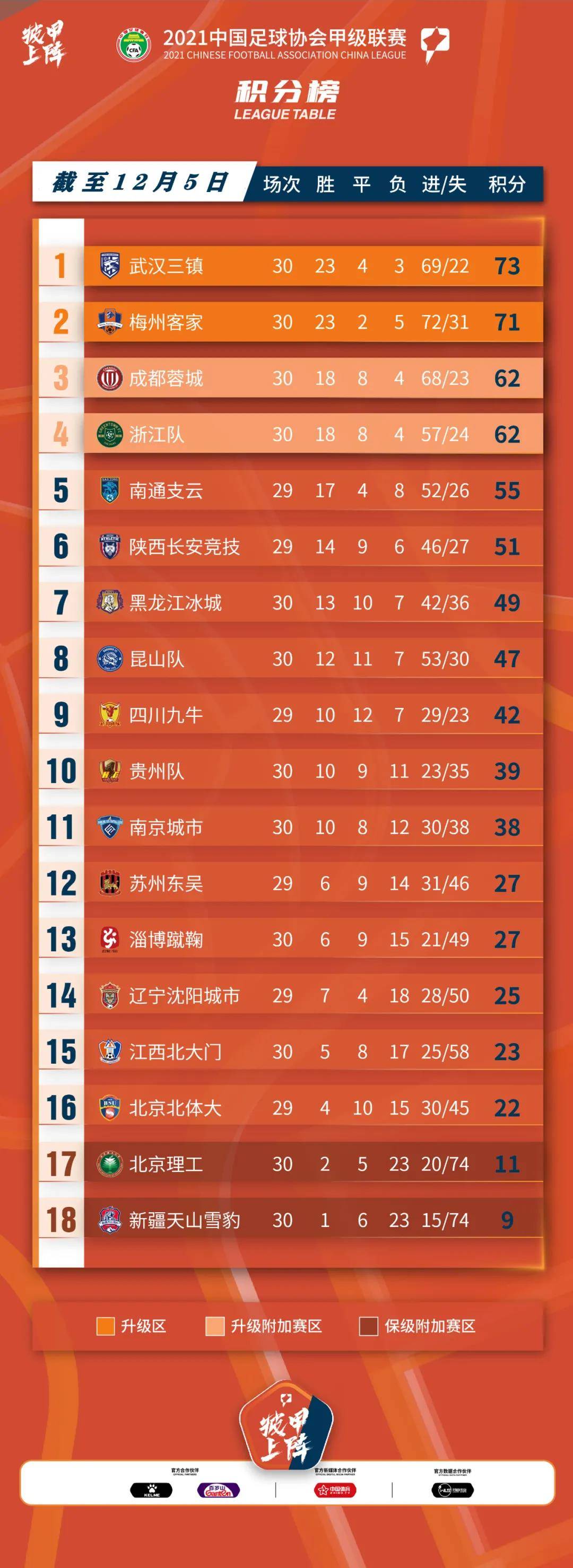 截止12月5日,武汉三镇以23胜4平3负积73分的战绩领跑积分榜,本轮他们2比1击败浙江队,保住了领头羊的位置;梅州客家23胜2平5负积71分位居次席;成都蓉城18胜8平4负积62分位居第3位;浙江队18胜8平4负积62分,因净胜球劣势下降至第4位。