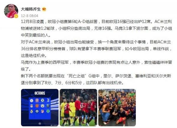 韩乔生写道:“12月8日凌晨,欧冠小组赛第6轮A-D组战罢,目前欧冠16强已经出炉12席。AC米兰利物浦被反转1:2输球,小组积分垫底出局,无缘16强。马竞3:1拿下波尔图,成为了小组中笑到最后的人。