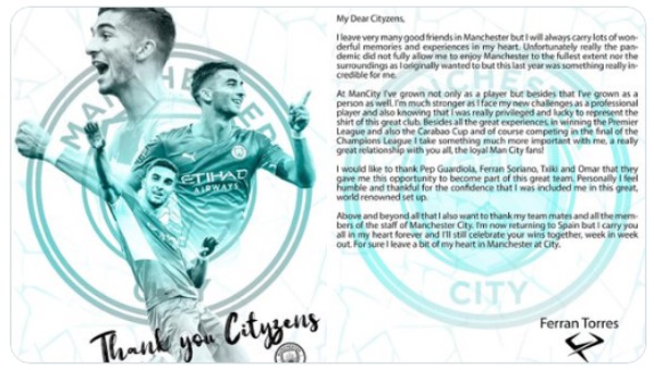 费兰托利斯(ferran torres)透过社交网络twitter发表了一封道别信,道出自己「曾经是蓝月亮球员,一辈子都是曼城人」:「亲爱的曼城球迷,我将要离开曼彻斯特的很多好朋友了,但我心中将会满载美好回忆和经历离开。不幸地疫情未曾容许我尽情享受身处曼市的日子,但去年对我来说的确是不可思议。作为一个球员,我在曼城成长了不少;我自己亦学到很多。作为职业球员的我,面对挑战时变得更坚强,可以穿起这伟大球会的球衣真是我的荣幸。」