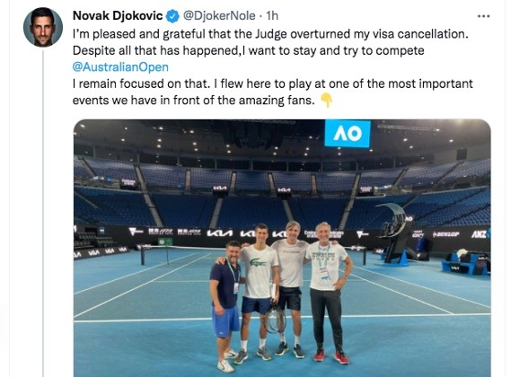 网球一哥祖高域(novak djokovic)於周一成功推翻澳洲政府决议,可入境签证出战今届澳网後首次公开发声,他於个人twitter上指现在起自己会专心竞赛。