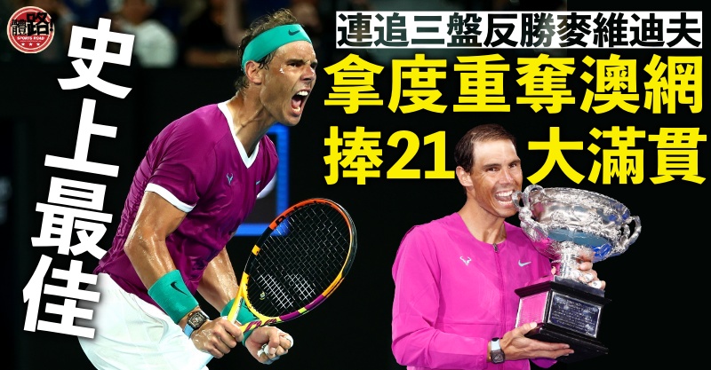 2022澳洲网球公开赛周日(30日)上演男单终极对决,第6次打入决赛、年届35岁的西班牙「天王」拿度(Rafael Nadal)拚尽老命,在先失两盘下风下连扳三城,激战逾5个半小时後以3:2反胜比自己年青10岁的国际排名第2球手麦维迪夫(Daniil Medvedev),事隔13年再次封王,发明前史捧走第21个大满贯,超越费达拿(Roger Federer)及祖高域(Novak Djokovic)成为史上第一人!