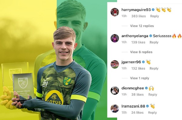有爱情!曼联借将班顿威廉斯近来当选诺域治1月最佳球员,哈利麦佳亚和艾兰加齐齐点赞。