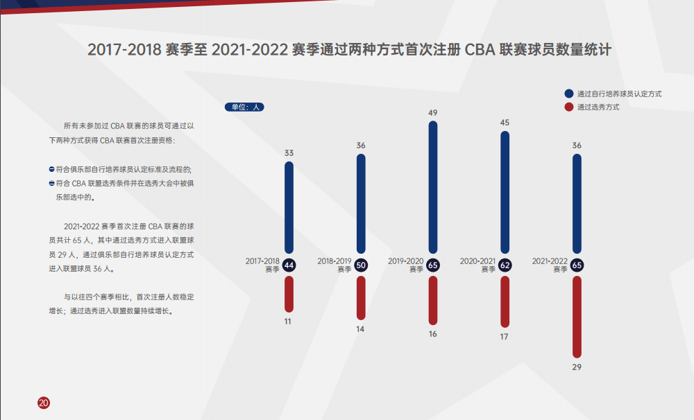 2021-2022 赛季初次注册 CBA 联赛的球员共计 65 人,其间经过选秀方法进入联盟球员 29 人,经过沙龙自行培养球员认定方法进入联盟球员 36 人。与以往四个赛季比较,初次注册人数稳定增长;经过选秀进入联盟数量持续增长。