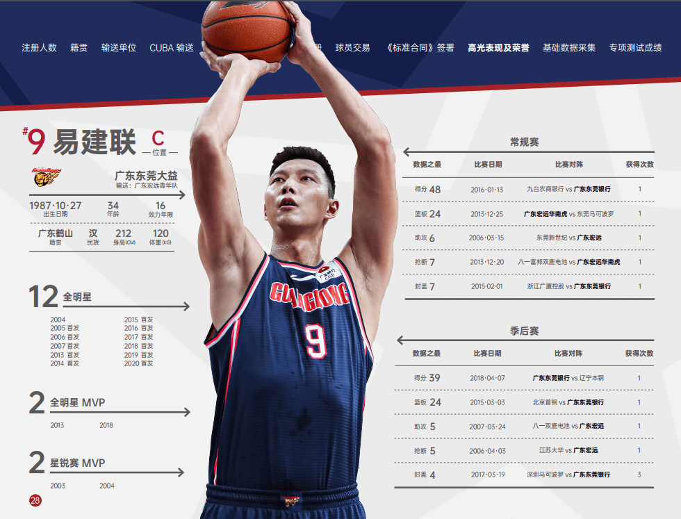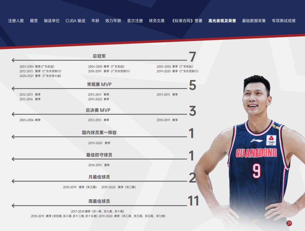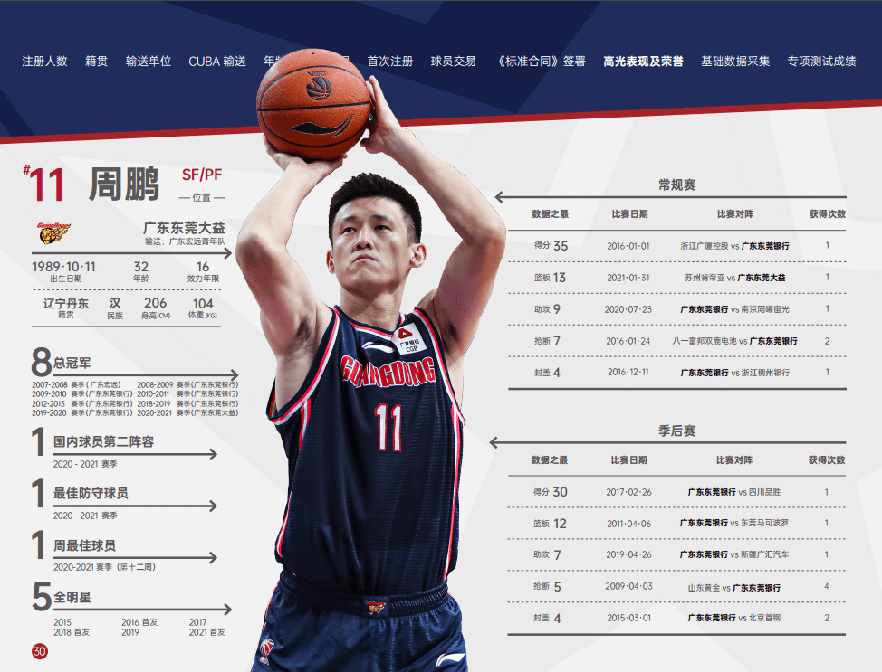 球员生计部分主要呈现球员基本信息、生计高光体现及荣誉。球员生计高光体现及荣誉数据到 2020-2021 赛季。球队排序依据 2020-2021 赛季 CBA 联赛最终名次。