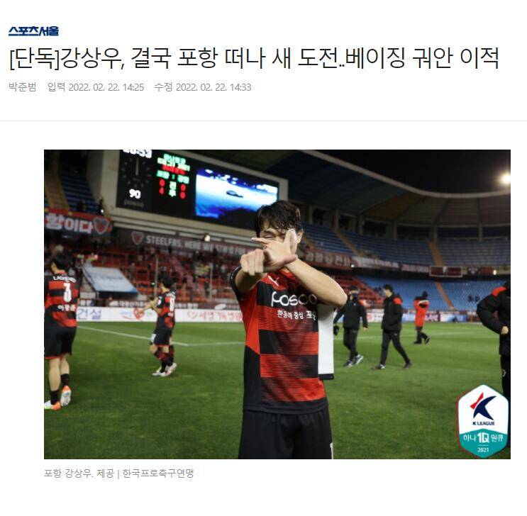 韩媒:浦项边后卫姜祥佑即将加盟国安 体检后前往北京