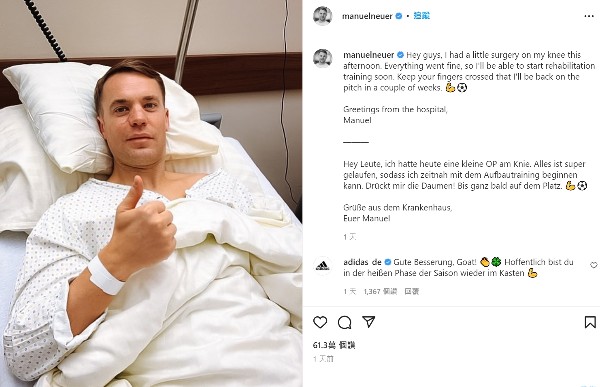 35岁的拜仁慕尼黑门将纽亚(manuel neuer)於周六面临莱比锡时弄伤膝部,需要开刀接受手术。周一拜仁便发表揭露声明说:「纽亚於周日成功为受伤的右膝进行手术,因此拜仁在未来数周将缺少这位队长。」