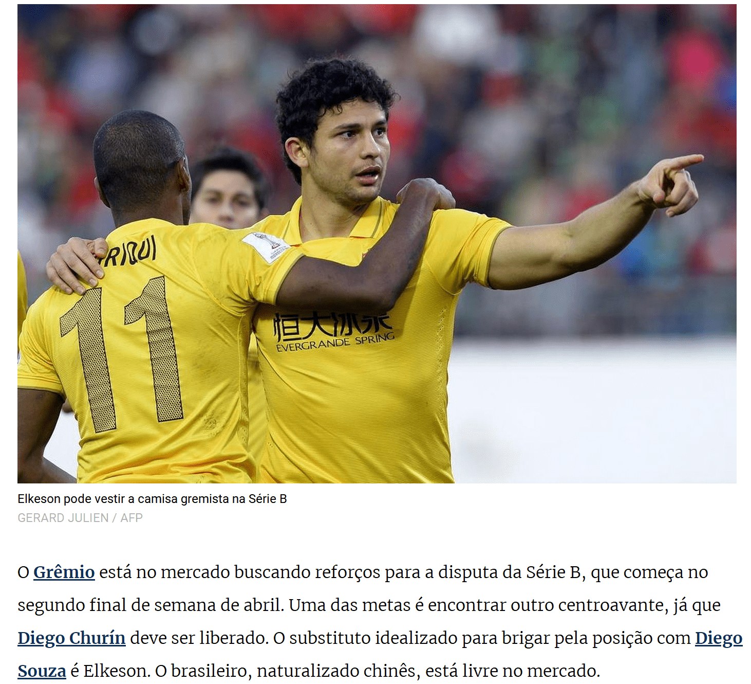 巴西媒体《GZH》报导称,格雷米奥现在正在转会市场上为4月份开赛的巴乙联赛进行补强,沙龙的目标是引进一名前锋球员,因为队内前锋迭戈-丘林行将离开球队,而艾克森则被认为是这个方位最理想的替代者,因为这名被归化的中国国脚现在在转会市场上是自在身。