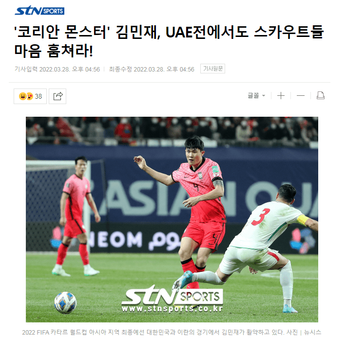 据报导,同伊朗的竞赛,多名来自欧洲的球探现场调查了金玟哉的体现:土耳其媒体27日表示,那不勒斯队的球探代表在观众席上观看了韩国与伊朗的竞赛,调查金玟哉,此外,来自英格兰的球探也现场观战金玟哉的体现。