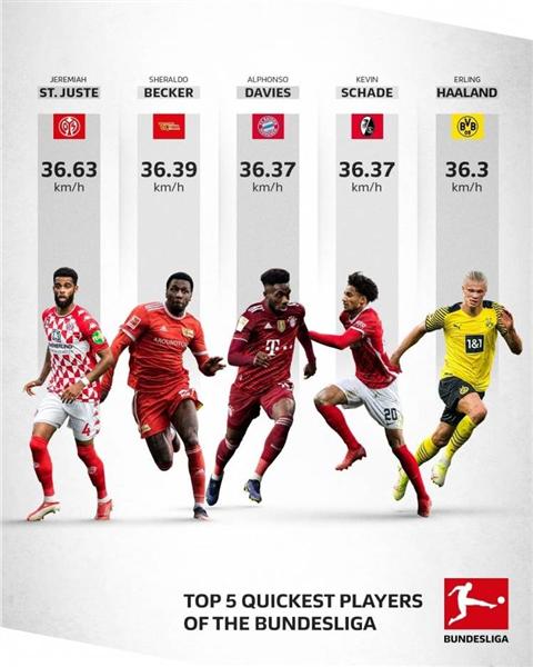 3月29日讯 德甲官方统计了本赛季各球员的最高瞬时速度,并排出榜单,美因茨后卫朱斯特以36.63公里/小时居首,阿方索-戴维斯位居第三,哈兰德则排名第五位。