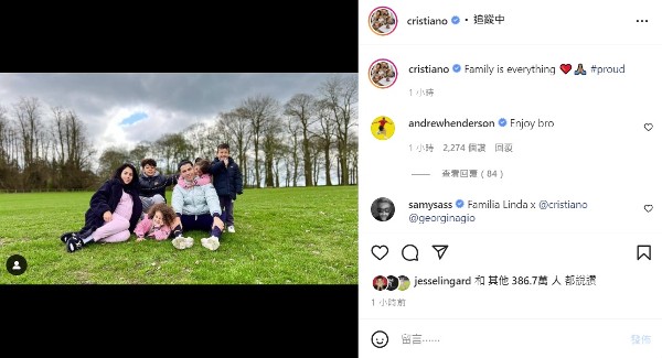 这场大战李城的比赛,曼联最终以1:1惊险战和对手,如果不是对手的入球被判无效,随时1分都无法保住。赛前汉历克称基斯坦奴朗拿度(cristiano ronaldo)有感冒病徵,状态不好;而比赛日当天亦有派医生亲临诊症,但因为c朗仍有不适,最後没有现身赛场。和波之後这位葡萄牙球星终於都有动静,不过却是在instagram上载自己一家的合照,并写上:「家庭就是一切」的语句,看来对外界的批评一点都不在乎。而照片中亦可见洛迪古丝腹大便便,看得出这个甜蜜一家随时会再添新成员。