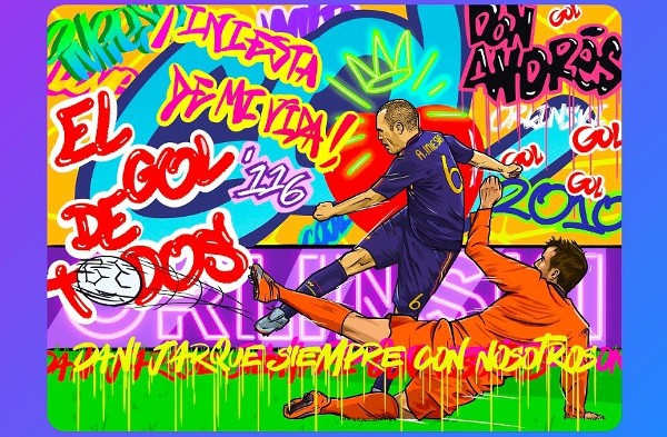 恩尼斯达(andres iniesta)宣布与法国艺术家奥连斯基合作,推出一系列以恩尼斯达为灵感,包括2008/09球季欧联4强对车路士的入球、2010年世界盃决赛对荷兰的入球等。
