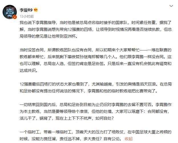 我也说下李霄鹏辅导,其时他是被总局点名暂时接手的国家队,时间紧任务重,据我了解,其时李霄鹏说想先带完12强赛的四场,让领导届时视状况再看是否持续执教,但总局领导的定见是让他带到亚洲杯。