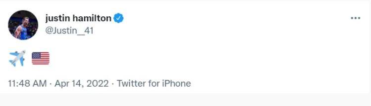 北京时间4月14日音讯,今日上午,北京男篮大外援汉密尔顿更新交际媒体,表示将飞回美国。