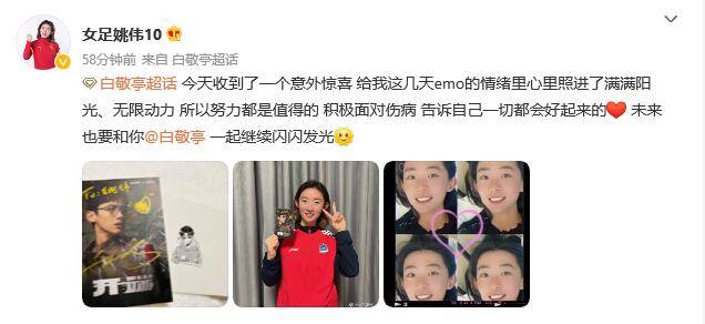 姚伟写道:今日收到了一个意外惊喜,给我这几天emo的心情里心里照进了满满阳光、无限动力。所以努力都是值得的,积极面对伤病,告诉自己一切都会好起来的。未来也要和你(@白敬亭)一同持续闪闪发光。