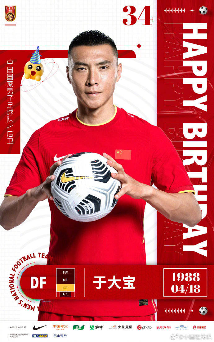 北京时间4月18日,今天是国脚于大宝34岁的生日,国足官方也在交际媒体上发文为其送上祝愿。