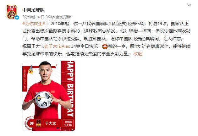祝愿于大宝34岁生日快乐!新的一岁,愿“大宝”有健康常伴,可以持续享受足球带来的快乐,也能持续为酷爱的事业贡献力量。