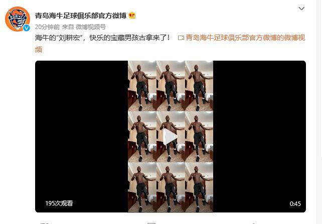 北京时间4月26日,中甲青岛海牛足球俱乐部在社媒上晒出了外援古拿跳《本草纲目》的视频,并写道:海牛的“刘耕宏”,快乐的瑰宝男孩古拿来了!