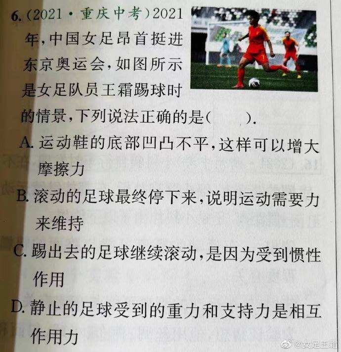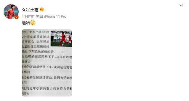 北京时间4月26日,中国女足队员王霜在社媒上晒出一张重庆中考题库的图片,并写道:“选啥”。
