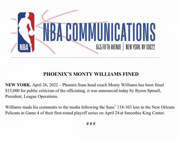 4月27日讯 今日,NBA官方宣告,太阳主帅蒙蒂-威廉姆斯因在G4赛后采访时公开批评裁判被罚款15000美元。