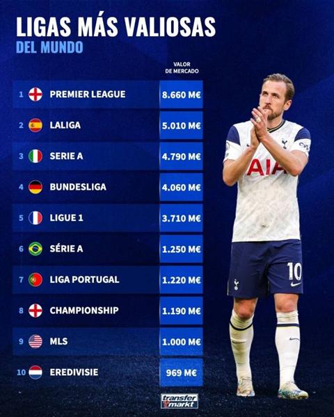 5月1日讯 德国转会商场网日前统计了全世界市值最高的联赛,英超86.6亿欧元排名第一,远超其他联赛。